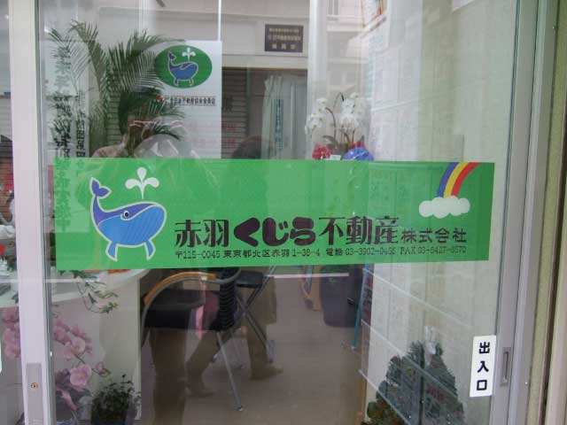 | くじら不動産様全景です。重ね貼りl(白フチ黒文字)加工でくっきり。インクジェット印刷もご利用いただきました。07/11 | |||||
