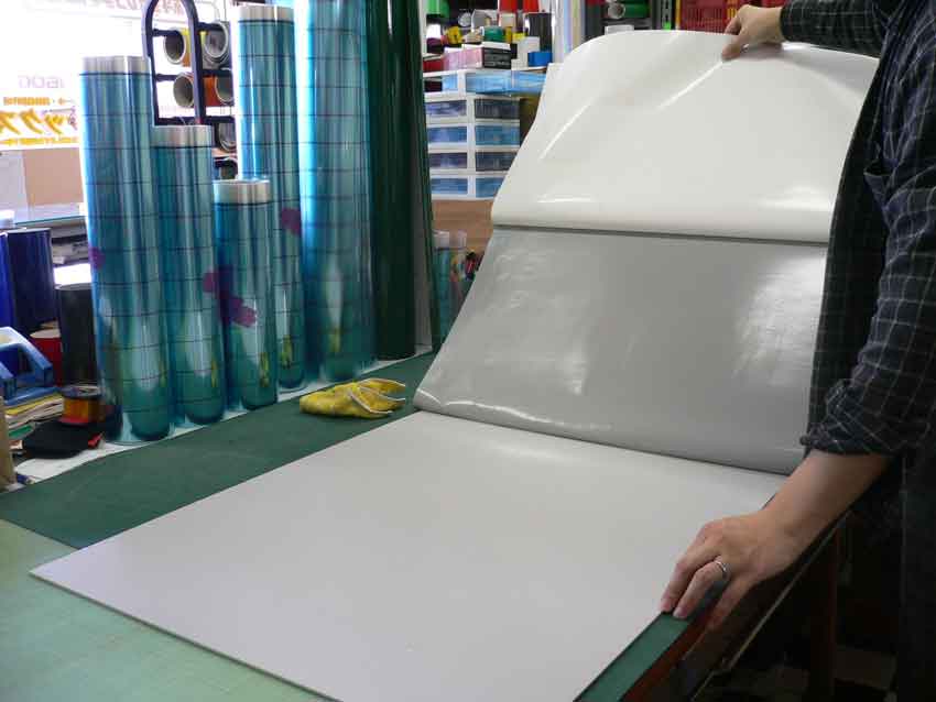 | 10,めくった分の台紙をカットします。カッターで切ってますが、お客さまはハサミが良いです。 |