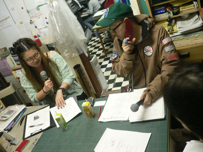 | Air-G北海道の車です。 | 店内でうち合わせ、コンサドーレの話しで和やかムードでした。 | 生放送開始!「フレックスさんから中継してます♪」とレポーターさん。 |